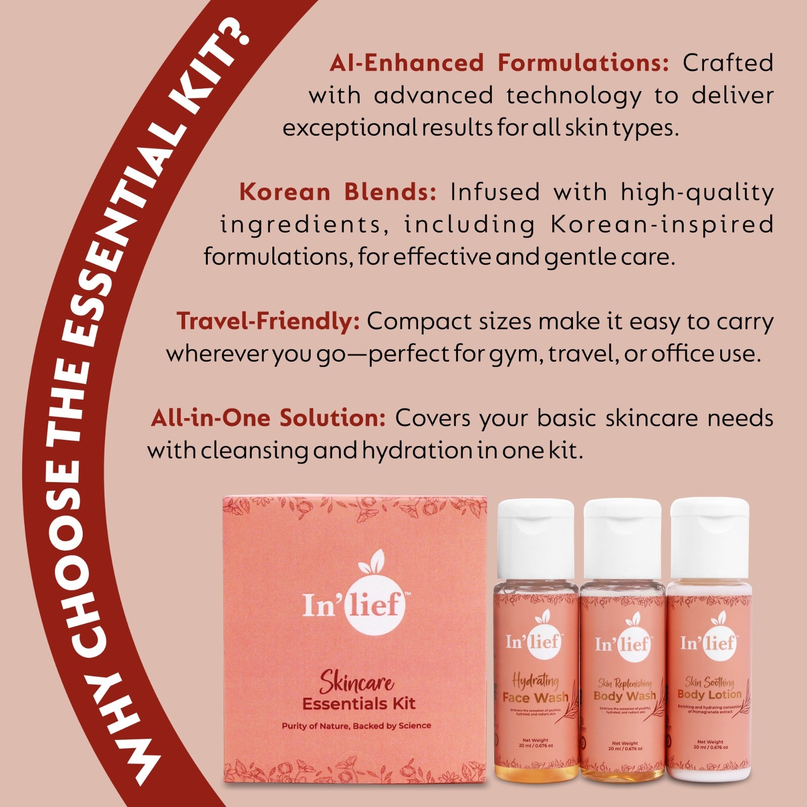 Experience the perfect blend of cleansing, hydration, and nourishment with the Essential Kit. Designed to suit your daily skincare routine, this kit offers travel-friendly sizes of our premium products, crafted with AI-enhanced formulations for maximum results.